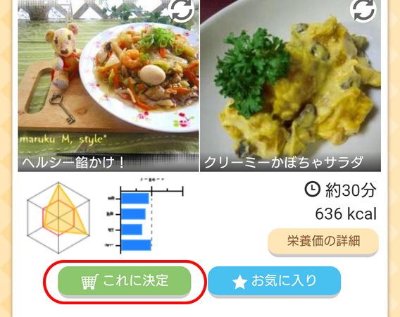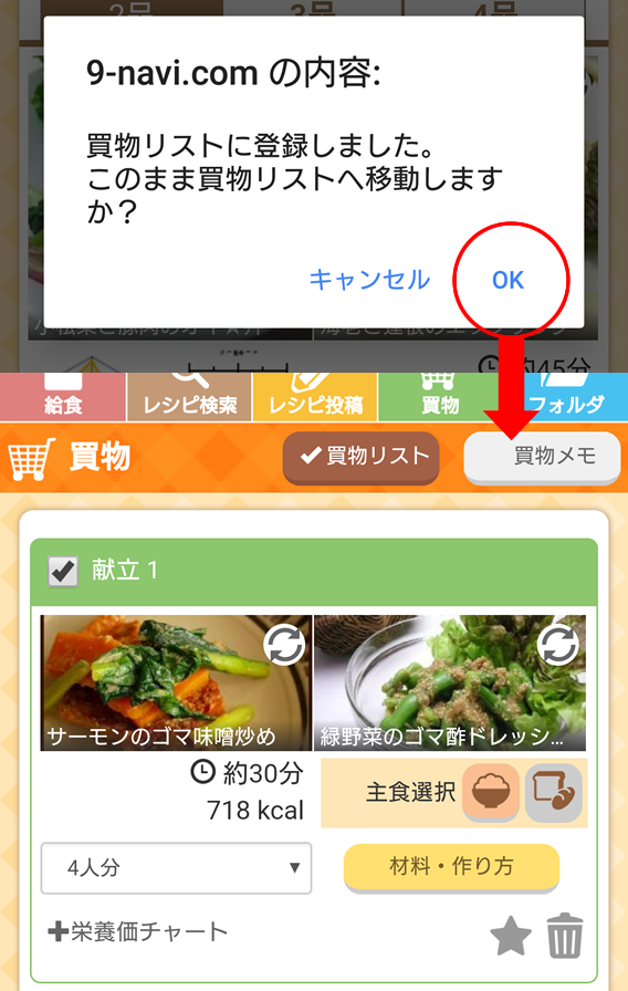 OK をタップすると買物リストが表示され、献立の詳細や作り方を見ることができます。