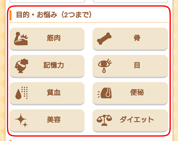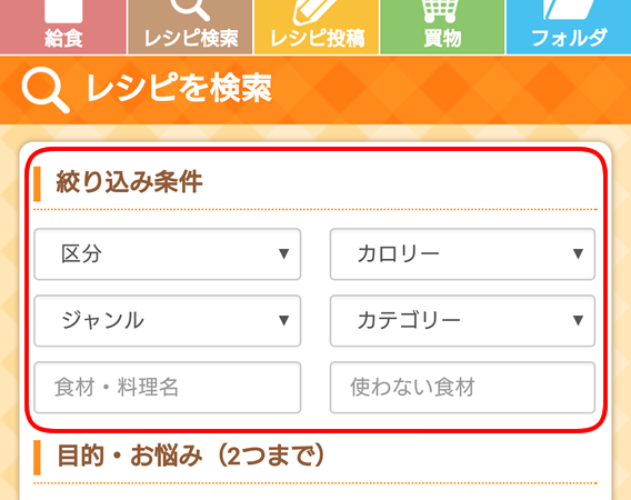 目的・お悩みに合わせた(弊社独自基準)レシピ検索ができます。2つまで選択できます。